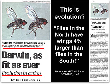 Then they say: “Evolution is as fit as ever. The fruit flies in the North have wings 4% larger than flies in the South.” Well, that proves something to somebody somewhere, I'm sure. But it's still a fly, ok. |