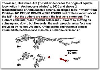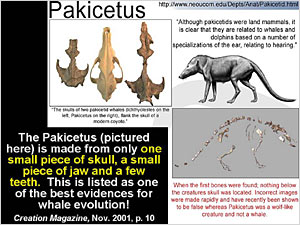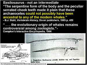 We could spend two days on whale evolution. Every one of them, Ambulocelus and Pakicetus have all been proven baloney. They can't be intermediate species, ok. The authors were certain the feet were enormous even though nothing was found. Basilosaurus could not possibly have been ancestral to any of the modern whales. “Pakicetus was made from one small piece of jaw, a small piece of skull, and a few teeth.” You find a little bit of jaw, a little bit of skull, a couple of teeth, and you know that it's half-whale, half-something on land? Ah, that's kind of a stretch, don't you think? We'll cover more on that later, but there's all kinds of stuff on our website about this.