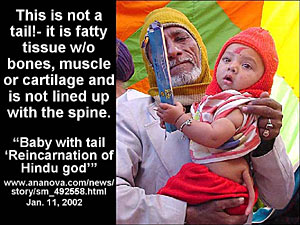 Notice they don't give that as an option, do they? Maybe it was designed to support your colon and support your lower back for posture when you sit. And five or six other things you can read about in Gray's Anatomy book, ok. They say: “Aren't babies born with tails once in a while?” No. “But that baby's got a tail right there.” No, he doesn't. It's not a tail. It's just fatty tissue; there is no bone, no muscle, no cartilage. It's not even lined up with the spine. It has to do with the way the baby develops inside the mother. There's fat around the nervous system to protect it until the bone grows around it. Generally, the fat is reabsorbed into the system as the baby grows and develops bone. But in extremely rare occasions, the fat is excluded outside the body like a big wart. So what you do, you cut it off, sew it up, put a diaper on the kid, and send him home. It's just like a wart, that's all it is. Cut it off. It's not a tail.